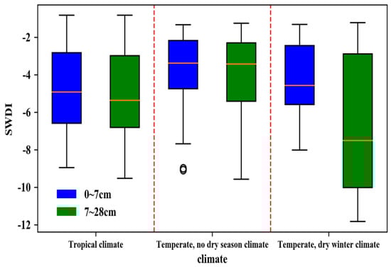 The SWDI calculated by the ERA5-Land dataset was evaluated on a weekly basis (Figure 4). The RMSE values are mostly between 2 and 3.5 in the three climate zones, which are relatively small compared to the range of the SWDI. In addition, the RMSE of the SWDI in the subsurface is much lower than that in the surface, while the RMSE values of soil moisture are quite similar in these two layers. The R values of the SWDI are mostly between 0.4 and 0.8, which are close to those of soil moisture. The bias values are mostly between −0.2 and 0.1, which are significantly smaller than those of soil moisture. In addition, the median bias of the subsurface is around zero. This may owe to the standardization in Equation (1) for the calculation of SWDI. Among the three climate zones, generally, the temperate, dry winter climate zone has the best performance according to the three statistics. This is different from the evaluation of soil moisture, which indicates that the performance of the SWDI is not necessarily in accordance with that of soil moisture. Note that it will be valuable to evaluate the uncertainty estimation of ERA5-Land using methods, such as those by Jedlicka et al. [32].