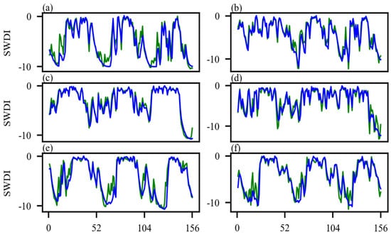 Weekly SWDI index in the surface (solid green line) and subsurface (solid blue line) layers at Dongfang (a), Qionghai (b), Fogang (c), Nanning (d), Lincang (e), and Yanshan (f) sites.