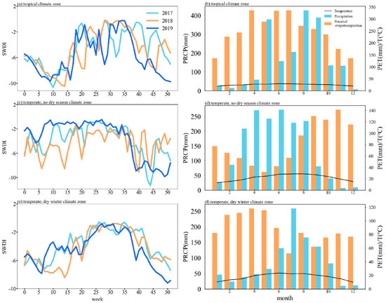 The weekly SWDI (left column) and the monthly temperature (T), precipitation (PRCP), and potential evapotranspiration (PET) (right column) in the tropical climate zone (top row, a,b), the temperate, no dry season climate zone (middle row, c,d), and the temperate, dry winter climate zone (bottom row, e,f) from 2017 to 2019.