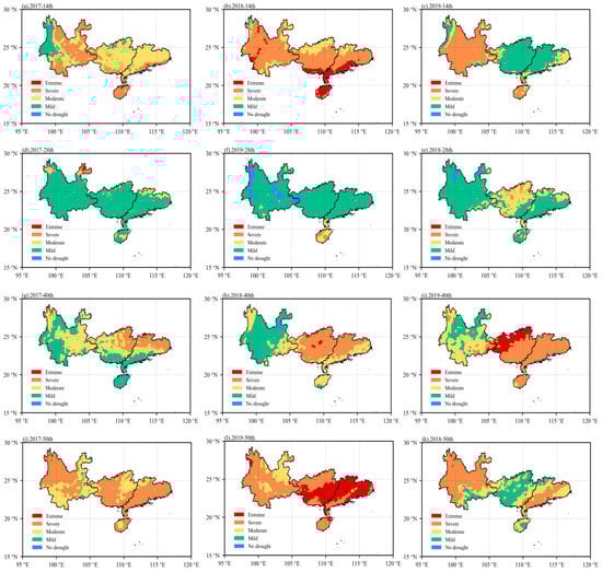 Spatial distribution of the weekly SWDI in the 14th (a–c), 28th (d–f), 40th (g–i), and 50th (j–l) weeks in the four southern provinces of China during 2017–2019.