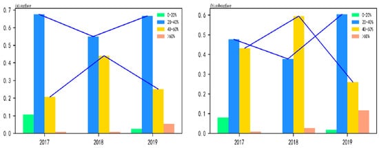 The PDW is divided into four categories: (1) 0–20% (i.e., representing less than 10 weeks of drought events); (2) 20–40%; (3) 40–60%; (4) 60–100% (i.e., representing more than 31 weeks of drought events). A higher percentage of grids that were located in the intervals of 40%– 60% and 60%– 100% indicated a higher percentage of drought events [10]. The PDW in the four intervals were quantified in the four southern provinces. It can be seen from Figure 10 that the percentages of grids in the four intervals varied among the three years. Most of the PDW values were between 20% and 60%. That is, the number of dry weeks in these three years was about 10–31 weeks. Generally, the PWD values of the subsurface were higher than those of the surface, as there are more values between 40% and 60%, indicating more droughts according to the subsurface. At the same time, the variation tendency of the PDWs was similar for the surface and subsurface in these three years. Figure 10 shows that the percentage of 20–40% was firstly decreasing, and then rising from 2017 to 2019. However, the percentage of 40–60% showed the opposite trend. Since most of the PDWs were in the interval of 20% to 60%, attention should be paid to drought monitoring in the four southern provinces in the coming years.