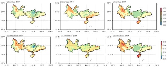 The distribution of the weekly SWDI in the surface and subsurface during 2017–2019.