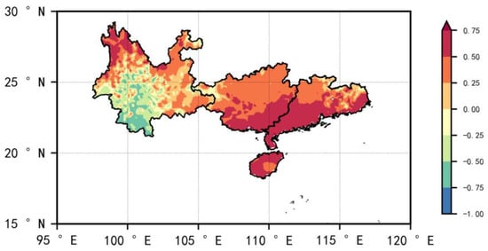 The purpose of this study was not to find out the meteorological factors that caused agricultural drought from 2017 to 2019, but to explore the relationship between agricultural drought and meteorological drought. The AWD was chosen to analyze this relationship. On the one hand, the AWD widely uses atmospheric data to reflect drought. On the other hand, the AWD can better capture drought dynamics related to the variation of soil water storage [39]. At the same time, changes in soil moisture at the surface and subsurface are closely related to changes in atmospheric moisture. For both the surface or subsurface (Figure 12, not shown for the surface as it is very similar to the subsurface), the correlation coefficients of Guangxi, Guangdong, and Hainan were above 0.25, and the correlation coefficients of Hainan and the coastal areas of Guangdong and Guangxi were above 0.5. The possible reason for the relatively high correlation is that these areas are close to the sea and relatively humid, so precipitation and evapotranspiration are the controlling factors affecting the changes in soil moisture. However, southwestern Yunnan had relatively small correlation coefficients, and some even showed negative correlations. A possible reason is that the surface water in mountainous regions was limited due to the high potential for infiltration because of complex topography [40]. In addition, studies have shown that soil and underlying bedrock, vegetation, and land use may also have important influences on soil moisture dynamics [41]. Thus, the precipitation and evapotranspiration are not the main controlling factors affecting the change in soil moisture, but the land surface conditions [42]. Opposite to this result, Bai et al. [18] showed a high correlation between the AWD and the SWDI based on the remote sensing data (SMAP) in Yunnan. This may due to the difference in the remote sensing data and the reanalysis data and may need further studies.