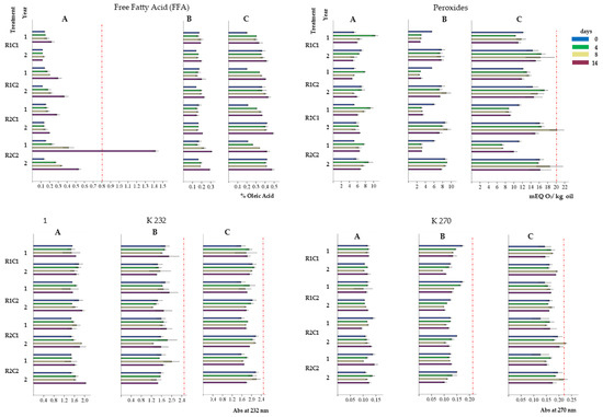 Free fatty acid (% oleic acid), peroxides (mEq O2/ kg oil), and absorbency at 232 and 270 nm, noted in the ‘Arbequina’ (A), ‘Picual’ (B), and ‘Verdial’ (C) olive oils extracted from fruit, picked with a Manual Inverted Umbrella (R1) and in a traditional way (R2) and stored for different days at 5 °C (C1) and ambient temperature (C2) during two consecutive years. Each bar is the mean ± SD of 3 replicates. Dotted lines indicate EVOO min. values (EEC).