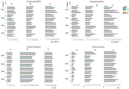Carotenoids (K460), chlorophylls (K670), oxidative stability (h), and bitterness index, noted in the ‘Arbequina’ (A), ‘Picual’ (B), and ‘Verdial’ (C) olive oils extracted from fruit, picked with a Manual Inverted Umbrella (R1) and in a traditional way (R2) and stored for different days at 5 °C (C1) and ambient temperature (C2) during two consecutive years (year 1 and 2). Each bar is the mean ± SD of 3 replicates.