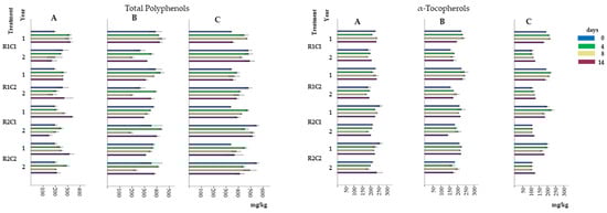 Total polyphenols (mg/kg) and α-tocopherols (mg/kg), noted in the ‘Arbequina’ (A), ‘Picual’ (B), and ‘Verdial’ (C) olive oils extracted from fruit, picked with a Manual Inverted Umbrella (R1) and in a traditional way (R2) and stored for different days at 5 °C (C1) and ambient temperature (C2) during two consecutive years (year 1 and 2). Each bar is the mean ± SD of 3 replicates.