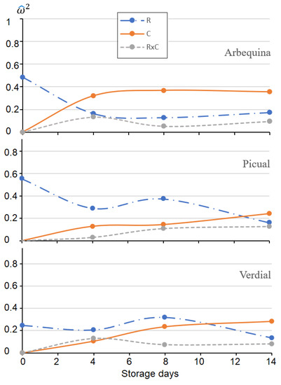 Magnitude of strength of the factors harvesting and conservation and their interaction for three different varieties (‘Arbequina’, ‘Picual’, and ‘Verdial’), based on the mean of the calculated omega-squared () values of 10 parameters (FFA, peroxides, K232, K270, oxidative stability, photosynthetic pigments, bitterness index, total polyphenols, and α-tocopherols) over 14 days.