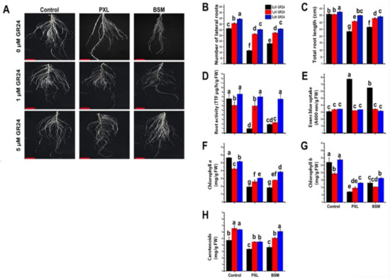 Plant root growth and development are primarily related to cell elongation, differentiation, and division in the root apex, which are partially regulated by SL [51,52]. However, the role of SL in plant growth and development under herbicide stress is not well understood. The present study indicates that PXL and BSM negatively affect both total root length and lateral root formation. However, the application of SL to plants exposed to either herbicide restores root growth to control levels (Figure 1). In Arabidopsis, the root length of several SL-biosynthesis mutants (MAX1, MAX2, MAX3, and MAX4) was shortened, but exogenous GR24 restored the phenotype in mutants MAX1, MAX3, and MAX4. In agreement with the current findings, SL also regulated root growth under other abiotic stresses [33].