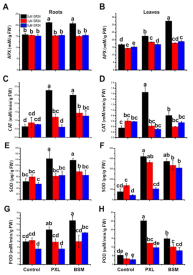 SOD activity increased by 124% and 115% in roots, and 436% and 376% in leaves under PXL and BSM treatments, respectively (Figure 2F). This implies higher dismutation activity in leaves than in roots and higher activity under PXL treatment than BSM. When GR24 was combined with herbicides, SOD activity was reduced, particularly in roots compared with leaves. Furthermore, 5 μM of GR24 treatment alone reduced SOD activity by 13% and 14% compared with control roots and leaves, respectively (Figure 2E,F).