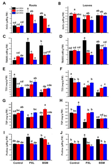 H2O2 accumulation and lipid peroxidation were investigated to confirm SL’s effect of mitigating oxidative damage. H2O2 in roots increased significantly in response to PXL (175%) and BSM (131%) (Figure 3A). However, there was no significant change in leaves under any treatment except for BSM and BSM with 5 μM of GR24, which showed significant decreases compared with 1 μM of GR24. The combined application of GR24 (1 μM and 5 μM) and PXL reduced H2O2 by 9% and 52%, respectively. Moreover, the combination of BSM and GR24 (1 μM and 5 μM) reduced H2O2 by 15% and 71%, respectively. The toxic effects of herbicides were mitigated by a dose-dependent GR24 application by reducing H2O2 concentrations (Figure 3A,B).