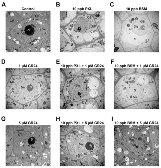 Ultrastructural analysis of roots and leaves was performed to assess the role of SL in mitigating herbicide-induced cellular injury. Under normal (herbicide-free) conditions, cells in the root tips exhibited oval mitochondria, small vacuoles, and well-developed nuclei, nucleoli, and nuclear membranes (Figure 4A). The application of PXL and BSM caused significant cellular damage, including swollen mitochondria, visible Golgi bodies, and starch granules in plastids, and a few giant vacuoles pushing the smaller nuclei into the corners of the cell. Thickened cell walls, large intercellular spaces, and irregular nuclear shapes were also observed (Figure 4B,C). No subcellular organ damage was observed in roots after treatment with GR24 (Figure 4D,G). Simultaneously, the mitochondrial swelling and vacuole expansion caused by PXL and BSM were alleviated by 1 µM of GR24 (Figure 4E,F) and restored almost to control levels by 5 µM of GR24 (Figure 4H,I).