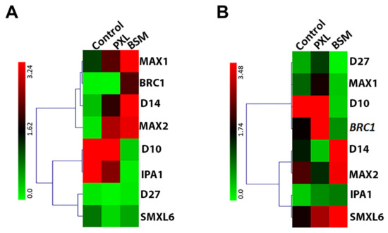 In this study, the induced expression of D14 and MAX2 under both PXL and BSM suggested the onset of the SL signaling response of watermelon to herbicide stress (Figure 5). In Arabidopsis and rice, the proteins D14, MAX2, SUPPRESSOR OF MAX2 LIKE (SMXL), and their orthologs form a complex required for SL perception and degradation of SMXL6 through the ubiquitination proteolysis system, which plays a central role in SL signaling. The degradation of SMXL6 is necessary for SL biosynthesis and the expression of BRC1, TCP DOMAIN PROTEIN1, and PRODUCTION OF ANTHOCYANIN PIGMENT1 genes [82,83]. BRC1 was up-regulated in BSM-treated roots and PXL-treated leaves (Figure 5). On the other hand, Mashiguchi et al. [84] reported that GR24 induced theexpression of BRC1. These findings imply that herbicides activate the SL response in watermelon, directly or indirectly enhancing resistance to such stresses.
