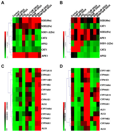 The expression of genes encoding antioxidant enzymes was investigated in herbicide-treated plants with and without SL application. The expression in roots of most antioxidant genes, including SOD (Mn), SOD2 (Fe), SOD1-2 (Zn), CAT2, and APX2, was induced by both herbicides. However, the GR24 application significantly antagonized this herbicide effect on the expression of SOD1-2 (Zn), CAT2, and APX2 and restored PXL-induced SOD (Mn) and BSM-induced SOD2 (Fe) expression. CAT1 and APX1 genes’ expression was also down-regulated by the GR24 treatment with or without herbicide stress (Figure 6A). Notably, the herbicides and SL exhibited different regulatory effects on antioxidant-related gene expression in leaves compared with roots. The expression of almost all examined genes was inhibited by PXL and/or BSM treatment, while all except APX2 were up-regulated by GR24 (Figure 6B). These results indicate that SL acts antagonistically against PXL and BSM in regulating the expression of antioxidant-related genes.