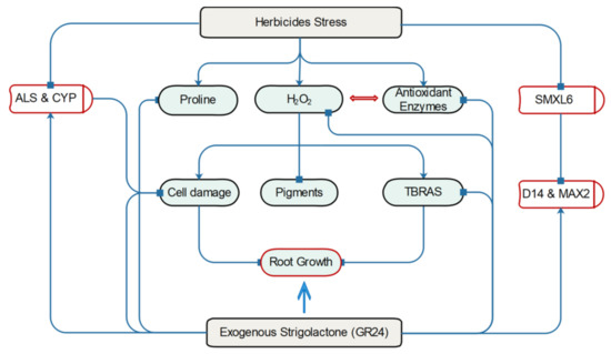 The schematic presentation of the alleviatory role of SL against herbicide stress in watermelon. Herbicides induce proline, H2O2, and antioxidant enzymes and suppress the negative regulator (SMXL6) of strigolactone biosynthesis (D14 and MAX2). This effect of herbicides negatively affects the expression of CYP and ALS genes. The exogenous application of GR24 restores the negative effects of PXL and BSM and enhances the root growth and development in herbicide-treated watermelon.