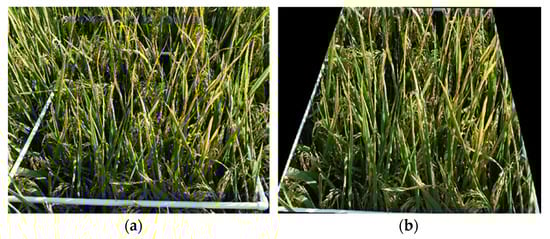 Data were collected in the fields around Shanji, Xuzhou, JiangSu Province, China (117°34′22″ N, 34°13′58″ E, 30 m above sea level), on 18–19 September 2020 at 10:00–16:00 under different sun light intensities and capture angles. A portable digital camera (D850, Nikon Inc., Tokyo, Japan) was used to capture RGB pictures of paddy rice. Most of the collected lesion images were at the growth stage and ranged from small water-spot-like short spots to vertical long stripes. The initial size of the images was 8256 × 5504 pixels (Figure 1a). Due to the fact that the initial size of one image was large, data were first cropped by the central area determined by the actual size of the 1 × 1 m white box shown in the images (Figure 1b). Then, after randomly cropping the central area, the final size of the images used to train and validate BLSNet was 256 × 256 pixels. The dataset consisted of 109 images, which were labeled as BLS lesion, rice leaves, and three background classes using LabelMe software [42]. Figure 2 shows the data labels.