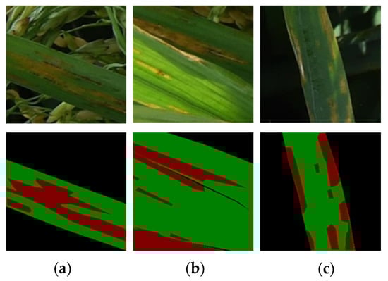 Image types and their corresponding labels, (a), (b) and (c), give three examples of the samples used for training and validation (red, green, and black stand for BLS lesion, leaves, background, respectively).