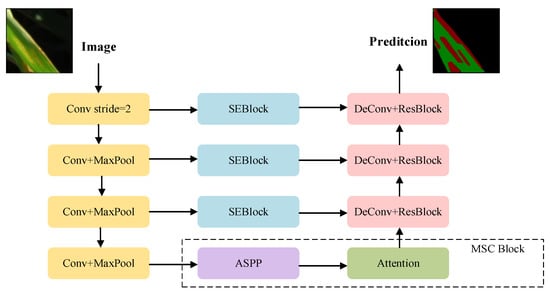 Based on the encoder–decoder architecture used in UNet [45], our BLSNet was designed to have five stages or blocks; namely, a down-sample stage, up-sample stage, skip connection with an attention block(SE block), atrous spatial pyramid pooling (ASPP) block [46], and multi-scale spatial channel attention block (MSC block). Figure 3 presents the overall network model architecture.