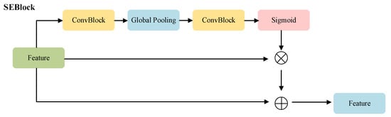 The SEBlock was composed of three branches: the upper branch generated the weight of every channel, i.e., the channel weights were extracted through the convolutional block and global pooling, followed by a convolution block comprising of two 1 × 1 operations of convolution. The sigmoid activation function was then used to scale channel weights to a range of 0 to 1. The output features of the SEBlock were the summary of the initial features dotted with the channel weight and the original features.