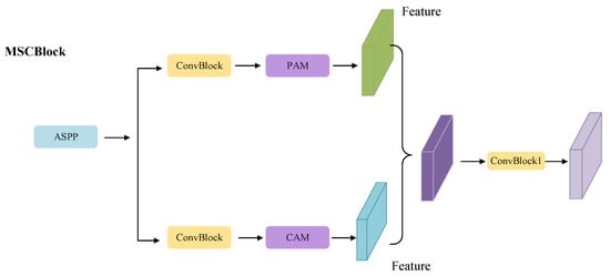 Figure 5 shows the information flow process of the MSCBlock, in which the higher semantic features are first filtered with ASPP to integrate multi-scale features and are then separately fed into the two branches (i.e., the position attention module (PAM) and channel attention module (CAM)). Figure 6 shows the structure of PAM and Figure 7 presents the diagram of CAM. Through both PAM and CAM branches, the position-enhanced and channel-enhanced features were then added, and a convolutional block with 1 × 1 convolutional operation was used to reduce channel numbers and refine the semantic contextual content to acquire the final high-level semantic features.