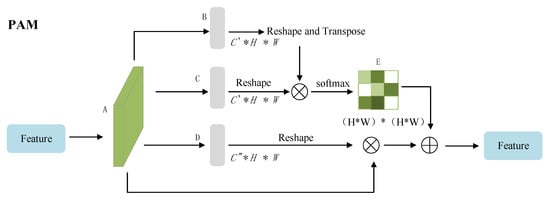 In the PAM branch, the features extracted by ASPP were first processed with the convolutional block, after which three 1 × 1 convolutional branches were used in the position attention module (PAM) to process the features and generate key feature map B, query feature map C, and value feature map D. The shape of feature maps B and C was then altered and dotted to generate spatial feature relation matrix E. Feature map D was reshaped to operate with E and generate enhanced position feature maps. The outputs of the PAM were the summary of enhanced position feature map and original features.