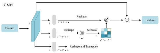 Similar to the design of the PAM branch, after the convolutional block three 1 × 1 convolutional branches were used in the channel attention module (Figure 7) to generate value feature maps B, query feature maps C and key feature maps D. Channel correlation feature maps E were obtained by C and D. Specifically, the shapes of C and D were first altered and matrix multiplication was performed. The final enhanced position feature maps were acquired using matrix multiplication of E with feature maps B. The outputs of the CAM were the summary of the enhanced position feature map and original features.