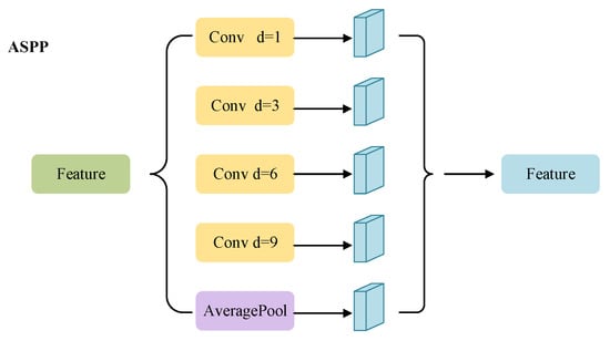 The ASPP block (Figure 8) consisted of five branches, four of which were two-dimensional dilation convolutions with a kernel size of 3, and dilation rates of 1, 3, 6, and 9, respectively; the last branch utilized average pooling to obtain global semantic information.