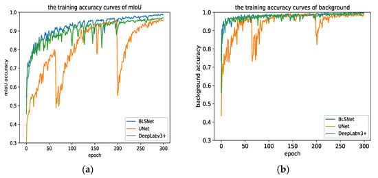 In the training process, the performance of the trained models used in the validation dataset was recoded every two epochs. From Figure 10, it can be seen that compared with the UNet and DeepLabV3+ methods, the change of BLSNet was smallest, indicating the stability and transfer capacity of this method.