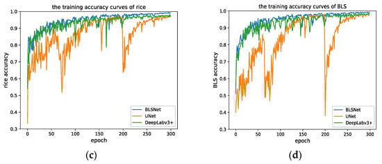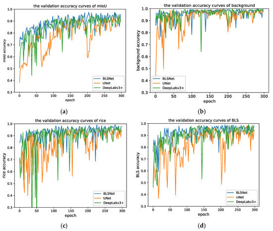 Training accuracy curves of different models. (a) The training curves of mIoU of three models; (b) the training curves of segmentation accuracy of background of three models; (c) the training curves of segmentation accuracy of rice of three models; (d) the training curves of segmentation accuracy of BLS of three models.