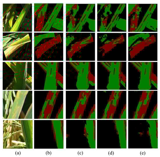 Comparison of prediction results for different models: (a) image (b) label; (c) UNet segmentation result; (d) DeepLabV3+ segmentation result; and (e) BLSNet segmentation result. Each row lists a representative sample, corresponding rice, BLS, and background label, the segmentation result of UNet, DeepLabv3+, and BLSNet.