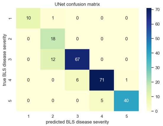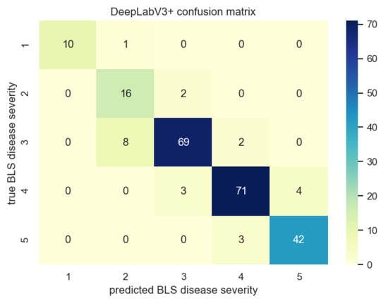 Precise areas of the disease lesion that are needed for the investigation of disease severity can be extracted based on the segmentation results. The trained models were used to segment the validation dataset, and the percentage of the BLS diseased lesion area in a sample was then recorded to obtain the disease severity in each image according to the criteria outlined in Section 2.2. To compare the effectiveness of BLSNet, UNet, and DeepLabV3+ in determining different levels of BLS disease severity, confusion matrices were used, as shown in Figure 12, Figure 13 and Figure 14. The classification accuracy of different levels of disease severity is shown in Table 5. In confusion matrices, the number in each row represents the number of the predicted category corresponding to the true category. It can be seen that for level 2 damage severity, UNet achieved the highest accuracy, while the best results of disease severity level determination were achieved by BLSNet for the other four levels. As for the overall classification accuracy, BLSNet was higher than UNet and DeepLabV3+.