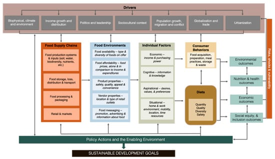 20. Downs, S.M.; Ahmed, S.; Fanzo, J.; Herforth, A. Food Environment Typology: Advancing an Expanded Definition, Framework, and Methodological Approach for Improved Characterization of Wild, Cultivated, and Built Foods Environments toward Sustainable Diets. Foods 2020, 9, 532. [Google Scholar] [CrossRef] [PubMed]