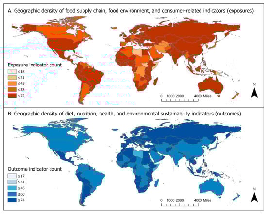As it does not engage in primary data collection, the FSD is unable to directly address the data gaps previously mentioned, however, it prioritizes indicators with broad country and regional coverage, that are likely to be collected on a regular basis. The FSD also utilizes application data interfaces (APIs) to integrate with primary data sources, ensuring that data will be updated on a continual basis. Figure 2 shows the geographic density of indicator availability in the FSD, for (a) food supply chain, food environments, and consumer-related exposures and (b) diet, nutrition, health, and environmental sustainability outcomes. The number of data points available in the dashboard does not vary substantially by region, however, in several conflict-affected countries, data is sparser, particularly in the case of food system exposures.