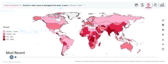 Figure 4. FSD visualization example—5-year growth in retail value of packaged foods. Source: (Euromonitor International 2020 [50]; “Food Systems Dashboard” 2020 [48,51]).