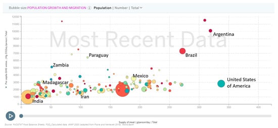 Figure 5. Per capita GHG emissions from food consumption versus the supply of meat, by country. Source: (“Food Systems Dashboard” 2020 [48,51])