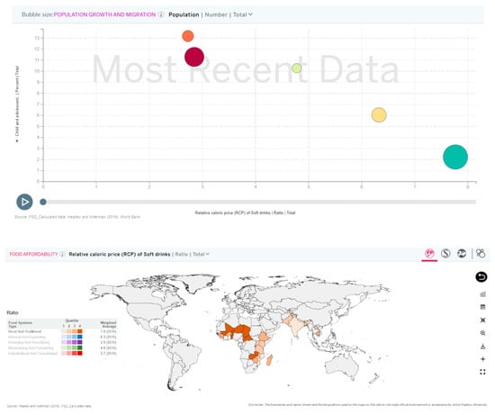 Finally, while many data gaps in the food system remain, the FSD will continue to feature the latest developed, most innovative metrics as these become available. As examples, the FSD recently added a set of indicators that describe the environmental footprint of food consumption from the World Wildlife Foundation (WWF, Gland, Switzerland) and will soon add several of the food affordability indicators featured in the 2020 State of Food Security and Nutrition in the World Report [9,49]. Using the FSD to further disseminate this data will draw more attention to these issues, which have been major priorities among food systems researchers and policymakers in recent years. Indicators still in the pipeline, such as the global food loss and global food waste indices, will also find a home in the FSD and specific attention will be given to other indicators that are relevant for SDG targets.