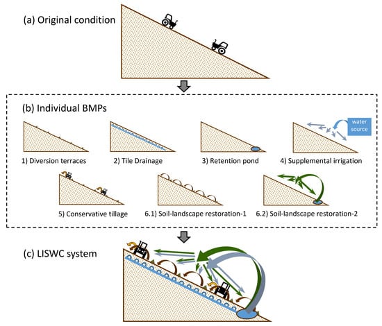 It is clear that the six BMPs discussed above all have their strengths and weaknesses. A logical question is: can these BMPs be applied in the same field so we can obtain all the benefits while minimizing some of the drawbacks, and if yes, how? In AC and northeast USA, a dominant landform type is rolling landscape, which is characterized by long and steep slopes []. These slopes are mostly linear across the slope (i.e., without much variation along the contour direction). Therefore, a one-dimensional linear slope is a good representation for such a landscape (Figure 1a). On such a linear slope, an LISWC system can be established by integrating BMPs as follows: (1) build a DTGW system to control water erosion (Figure 1(b1)); (2) install drainage tiles to quickly remove excessive water (Figure 1(b2)); (3) direct surface and tile drained water into a WRS (e.g., a pond) to retain water, sediment and nutrients (Figure 1(b3)); (4) use the retained water for supplemental irrigation during dry periods (Figure 1(b4)); (5) apply contour and upslope-throw tillage to reduce water and tillage erosion (Figure 1(b5)); and (6) apply soil–landscape restoration by moving soil from the bottom to the upper part of a terrace and from the retention structure back to the eroded spots in the field to restore soil health at these eroded spots (Figure 1(b6.1 and 6.2)).