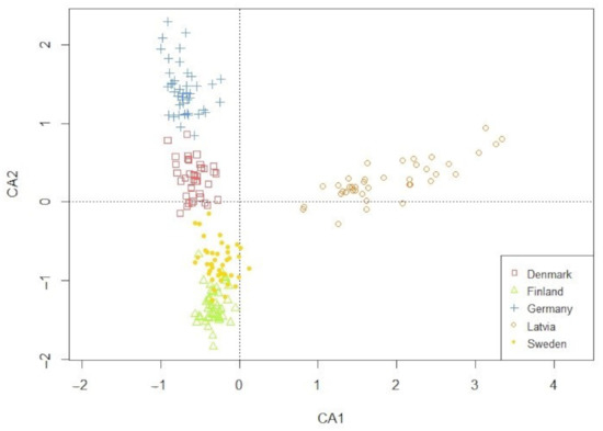 The ordination plot of the CA performed on the weed communities demonstrated a clear geographical clustering (Figure 1). The full species list is available in Table A1 (Appendix A). According to their individual weed communities, fields within a region were visibly similar and clustered in a north-to-south orientation. In contrast, Latvia deviated from this picture by settling into its own cluster. This clustering reflected the regionally diverse environmental factors, which in turn created a weed community that was regionally distinct.