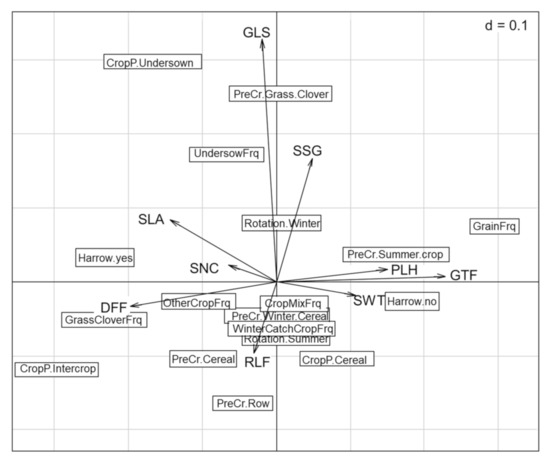 Biplot representing traits (arrows) and management (boxes) data. Traits: Raunkiaer life form (RLF), growth form (GTF), Grime’s life strategy (GLS), specific leaf area (SLA), plant height (PLH), seed weight (SWT), duration of flowering period (DFF), seasonality of germination (SSG), and affinity to soil nutrient conditions (SNC). Management: harrowing (yes, no), crop present (cereal, intercrop, undersown), previous crop (cereal, grass clover, row crop, summer crop, winter crop), dominant seasonality of the crop rotation (summer, winter), crop diversity frequency in last 5 years (crop mixture, undersowing, winter catch crop), and rotation frequency in last 5 years (grain, grass clover, other crops).