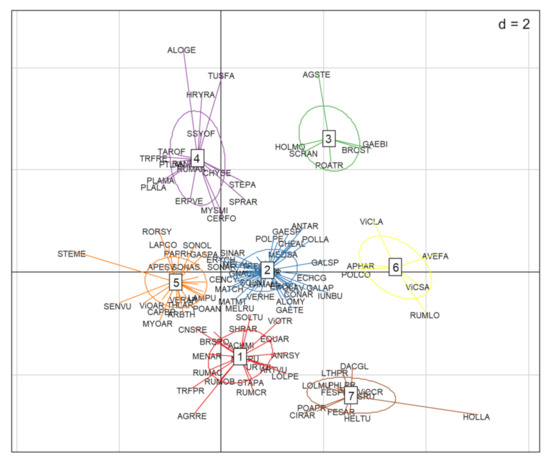 Ordination plot of species with functional group clusters along the first two RLQ axes. EPPO codes are used to indicate the weed species [33]. Not all species are displayed for readability. Functional groups: (1) competitive perennials, (2) larger annuals, (3) annual grasses, (4) grassland perennials, (5) smaller rosette forming annuals, (6) big seeded annuals, and (7) perennial grasses.