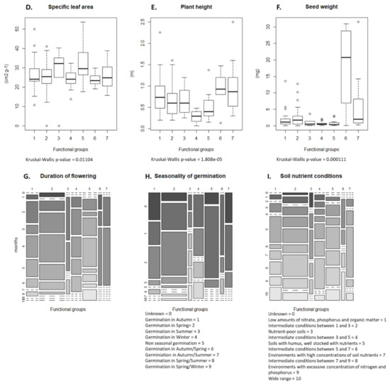 (A–I) Distribution of trait values within the seven functional groups. Boxplots are used to display continuous traits, while mosaic plots are used for categorical traits; in the case of duration of flowering, a mosaic plot was also chosen. Functional groups: (1) competitive perennials, (2) larg annuals, (3) annual grasses, (4) grassland perennials, (5) rosette forming annuals, (6) big seeded annuals, and (7) perennial grasses.