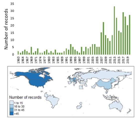 Number of articles published annually from 1960 to 2020 (barplot) and their distribution across countries (world map), according to the Web of Science request formulated on 30 March 2021 as follows: (wireworm* OR (click AND beetle*) OR agriotes) AND (IPM OR biocontrol OR control OR management OR regulation OR “risk assessment” OR “decision support” OR DSS). A total of 386 articles were published over the period under study, with a sharp rise around 2005.