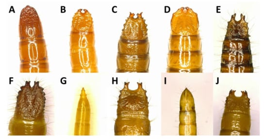 Variability in rear end for wireworm species from different genera. (A) Melanotus punctolineatus, (B) Cidnopus aeruginosus, (C) Athous haemorrhoidalis, (D) Cidnopus pilosus, (E) Prosternon tesselatum, (F) Agrypnus murinus, (G) Adrastus sp., (H) Hemicrepidius niger, (I) Agriotes sputator, and (J) Selatosomus aeneus.