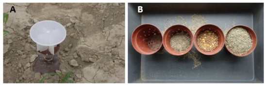 A considerable amount of work has been done in North America and Europe to assess the potential of replacing time-consuming soil sampling with in-field wireworm bait stations []. Due to the sampling effort they require and the non-random distribution of the larvae in fields [], soil sampling is of little interest []. Bait systems utilize the attraction of wireworms by the CO2 given off by respiring seeds []. Wireworms probably perceive CO2 via clusters of sensilla on the maxillary and labial palps []. This probably accounts for the fact that although a large range of vegetable- and cereal-based baits have been tested, baits based on germinating cereal seeds tend to be the most effective [,]. In addition, baits based on germinating cereal seeds put in pots (Figure 3B), proved to be an unbiased, time-saving monitoring tool for Agriotes wireworms. Since significantly more larvae are found inside the pot than in the other trap types (i.e., plates and mesh-bags), this method can be used without the time-consuming evaluation of the surrounding soil cores []. This trap design proved to be effective for attracting non-Agriotes species (Aeolus mellillus, Limonius californicus, L. infuscatus) as well []. The catch potential of pot baits can be augmented by increasing the number of pot holes []. Various techniques for improving the efficacy of wireworm bait systems have been tested. These include covering the bait with plastic [,] to raise the soil temperature. The trap designed by Chabert and Blot [], a modified version of the trap described by Kirfman et al. [], comprises a 650 mL plastic pot (10 cm in diameter) with holes (the ordinary number of those used for tree nursery) in the bottom. The pots are filled with vermiculite, 30 mL of wheat seeds, and 30 mL of maize seeds; they are then moistened before being placed into the soil 4–5 cm below the soil surface, after which they are covered with an 18 cm diameter plastic lid placed 1–2 cm above the pot rim. These traps have been used long term following a standardized procedure by Furlan []: traps were hand-sorted after 10 days when the average temperature 10 cm beneath the surface was above 8 °C [,] to ensure that the bait traps stayed in the soil for an equal period of wireworm activity. The final number of larvae was assessed under the aforementioned conditions, regardless of larvae behavior on individual days. Population levels should be assessed only when humidity is close to field water capacity. Indeed, dry top-soil forces larvae to burrow deep beneath the surface, away from the bait traps [], and high humidity (flooding in extreme cases) prevents larval activity since all the soil pores are full of water and contain no oxygen.