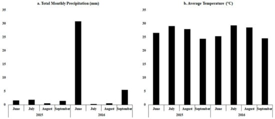 Meteorological data during both cropping seasons: (a) monthly precipitation, and (b) monthly average temperature.