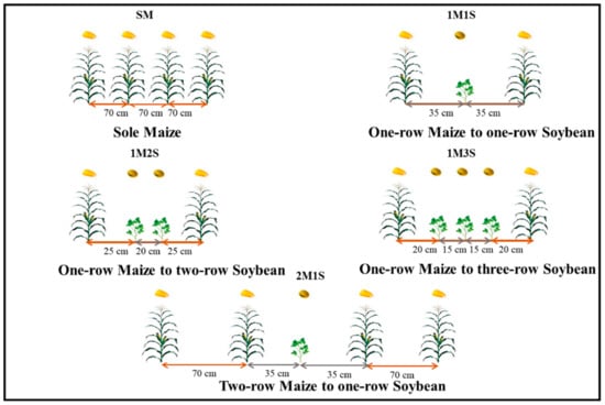 The summer season was ideal for this intercropping because of the seasonal rotational number of crops and suitable sowing time for maize. The summer maize (Zea mays L.) local variety recognized as “Zheng Dan 958” was used in this study. It is red in color, and takes 90–110 days to reach the maturity stage. Its seed was supplied by the Seed Company Agricultural Technology Extension Station. The soybean (Glycine max L. Zao Huang) crop variety named as a local and annual variety, which matures at 60–75 days, was also used. These soybeans were obtained from a farmer at the Seed Company Township Station. The experiment was a split plot design in a randomized complete block design replicated four times. The main plot treatments were mono-crop and intercropped forages and silages, whereas, maturity was assigned to the sub plots. The individual plot size was 12 m × 5 m. The experimental planting patterns of maize and intercropped maize-soybean are schematized in Figure 2. The experimental treatments consisted of maize seeded as a sole crop (SM) and intercropped with soybean with different planting structures as follows: one-row maize to one-row soybean (1M1S), one-row maize to two-row soybean (1M2S), one-row maize to three-row soybean (1M3S), and two-row maize to one-row soybean (2M1S).