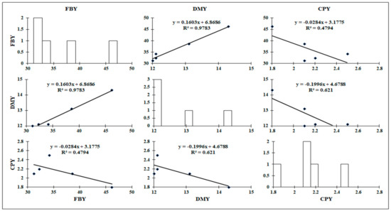 Scatterplot matrix including equation and regression values for pairwise correlation analyses between fresh biomass yield (FBY), dry matter yield (DMY) and crude protein yield (CPY) of maize and intercropped maize-soybean fodders. Diagonal boxes show histograms for each variable. The lower triangular matrix shows the relationship between a pair of variables.