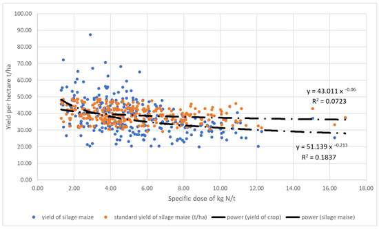 Figure 2 shows in detail the distribution of higher specific doses of nitrogen in silage maize, which increase in proportion to the decreasing soil fertility characterized by the standardized yield under the given conditions. The statistical evaluation has shown that the specific nitrogen doses in less favourable areas increased proportionately with decreasing soil fertility, which generally defines a standardized yield under the given conditions. The reason may be in addition to the normal crop damage and the requirement for higher yields in less fertile areas, where the biogas plants are often located. The maize is the most suitable crop for biogas plants due to its high dry matter biomass yield and high specific methane yield [48,49].