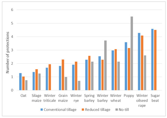 The number of chemical protections of evaluated crops cultivated in relation to different tillage systems is shown in Figure 5 and Table A11 and Table A12 in Appendix B. Despite the limited amount of data from the no-till system, a lower number of total protections is evident at the no-till system for most crops. In most cases, there was no difference between CT and RT system for the total number of protections as well as the number of preventive and urgent protections. However, a lower number of urgent protections was proved for winter wheat, winter oilseed rape and spring barley cultivated at the no-till system. Effect of tillage system on the yield of evaluated crops was not significant with the exception of higher yield of sugar beet and winter oilseed rape cultivated at CT. On the other hand, winter barley showed a higher yield at the no-till system. While there is demand for higher productivity of field crops, there also is increasing pressure to reduce the negative impacts of agriculture and its activities [24]. There is a growing awareness among farmers about the importance of soil for sustaining crop production and providing beneficial ecosystem services [56].