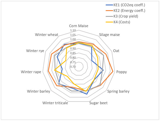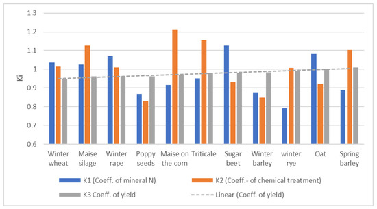 By the findings of other authors [50,51] lower yields of some crops with RT were found (K3 coefficient for sugar beet 0.94, silage maize 0.97, winter wheat 0.94, winter oilseed rape 0.97, winter barley 0.96), the yield increased in oats (1.05) and winter rye (1.05) (Figure 4).