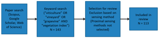 Holistic research of papers has been conducted in Scopus, Google Scholar and Web of Science. The review method is separated into three phases (Figure 1): the review planning, execution and review reporting which follows in the results, while a relational database model was created for the management of the research papers evolving the methodology of Adamides (2020) [17]. The research of publications focused on “viticulture” or “vineyard” or “grapevine” and “vegetation index” keywords. 143 research papers were downloaded and after the removal of duplicates and publications with proximal sensing methods 113 papers were finally taken in consideration. A total of 97 different vegetation indices were gathered from multispectral and hyperspectral imagery. In addition, information was collected just like the year of the publication, the journal, the application and the sensor.